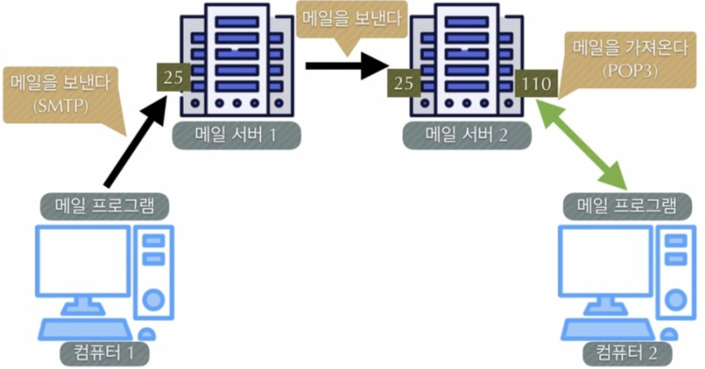- 메일 보낼때는 메일 서비스를 제공하는 포털 사이트나 회사의 메일 서버에 메일 보내는 것