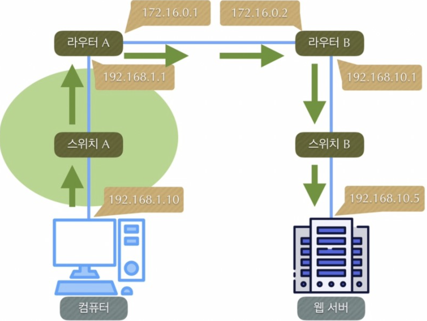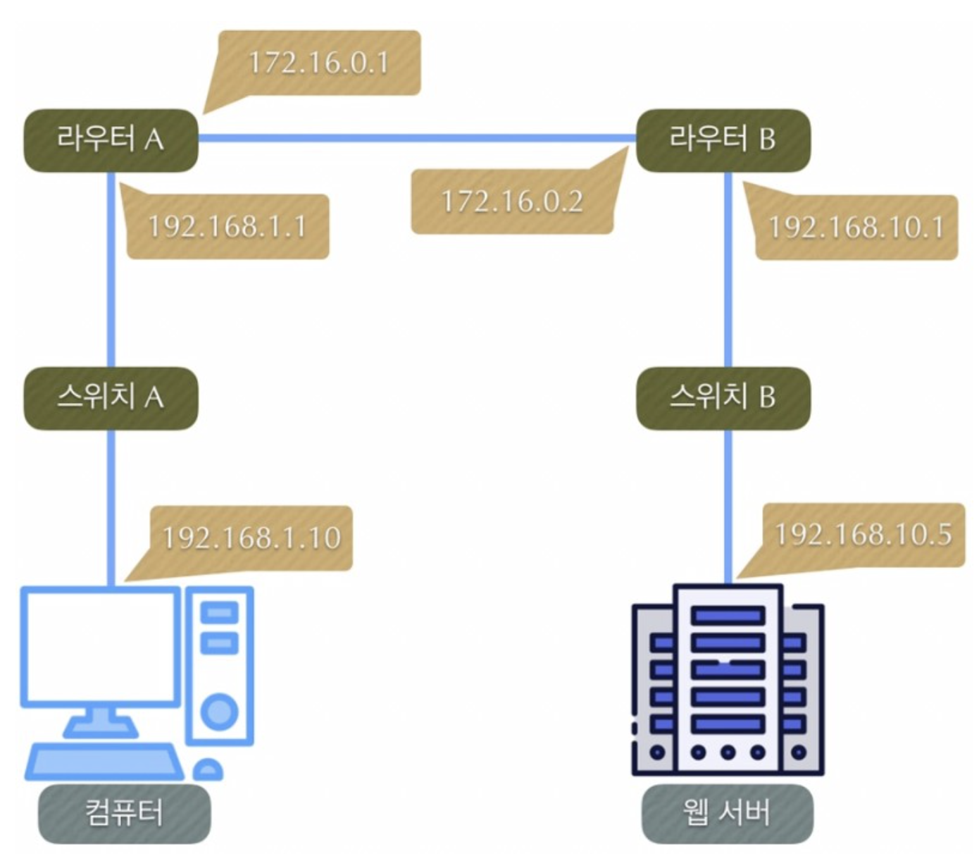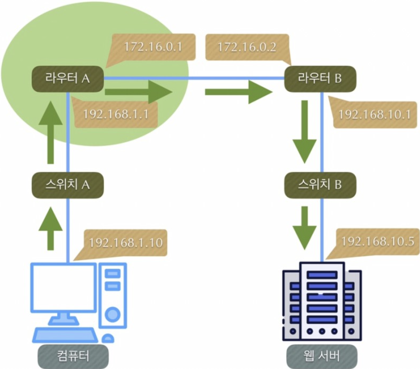 - 라우팅 : 패킷을 목적지 컴퓨터까지 보낼 때 최적의 경로를 선택해 전송하는 것
