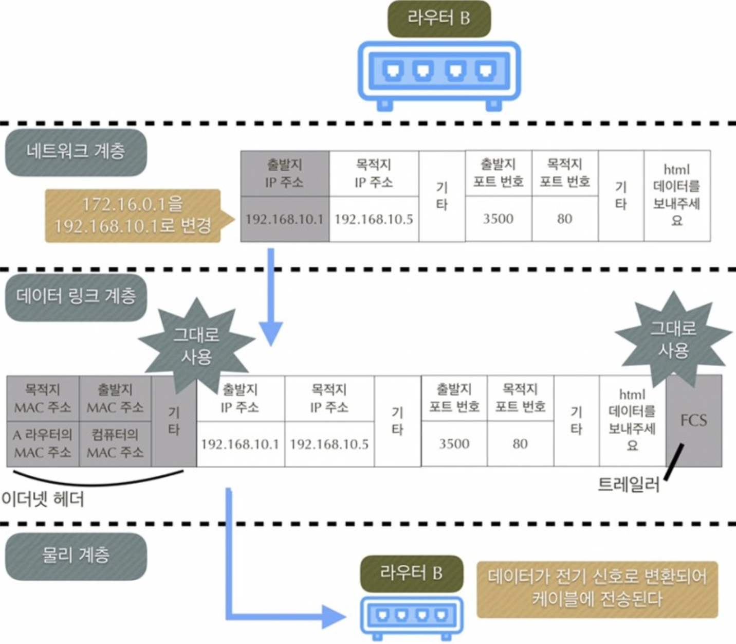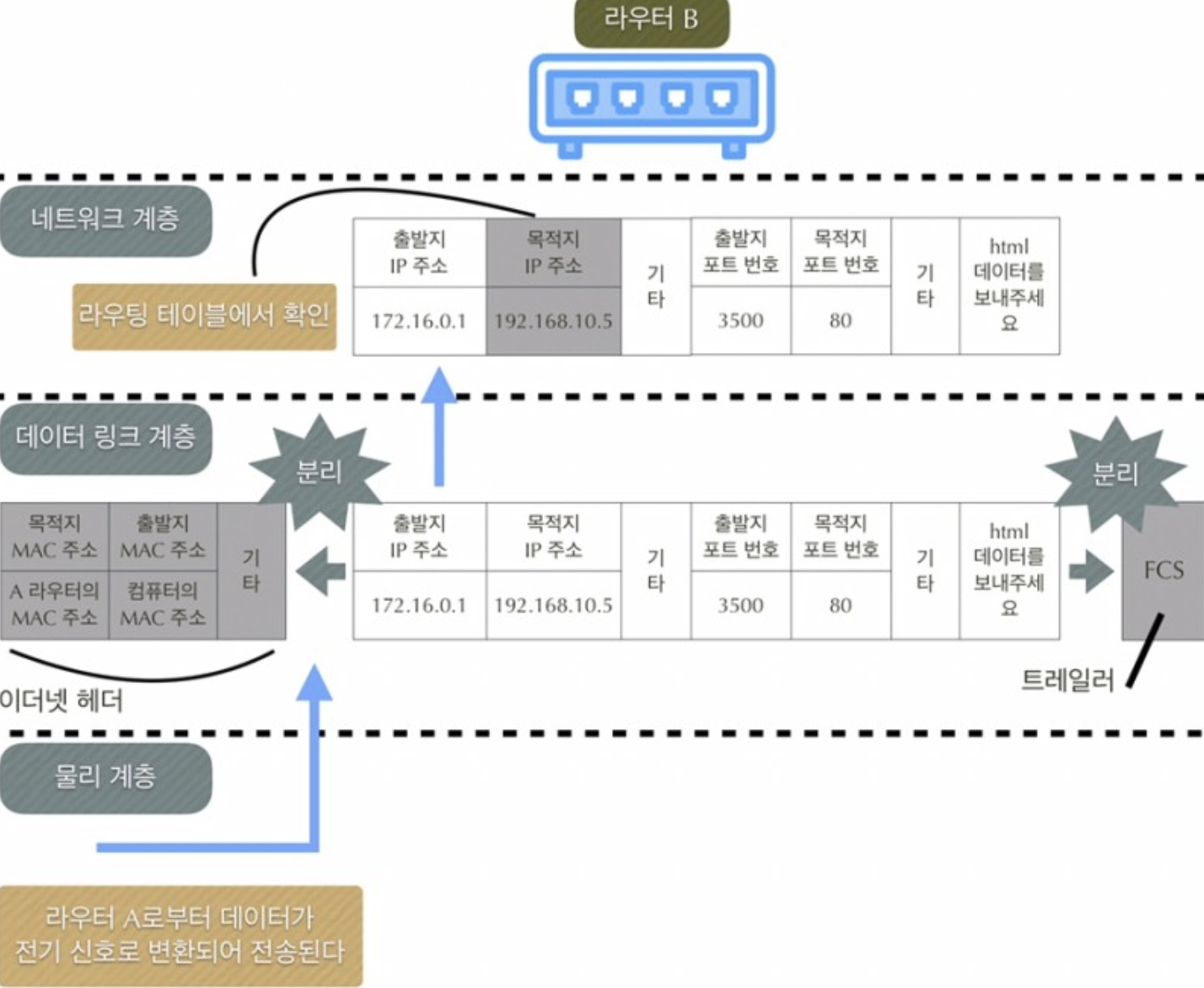 - 데이터 링크 계층으로 전달해 라우터 B로 보내지도록 이더넷 헤더와 트레일러 붙인 후 물리 계층에서 데이터를 전기 신호로 변환해 네트워크로 전달