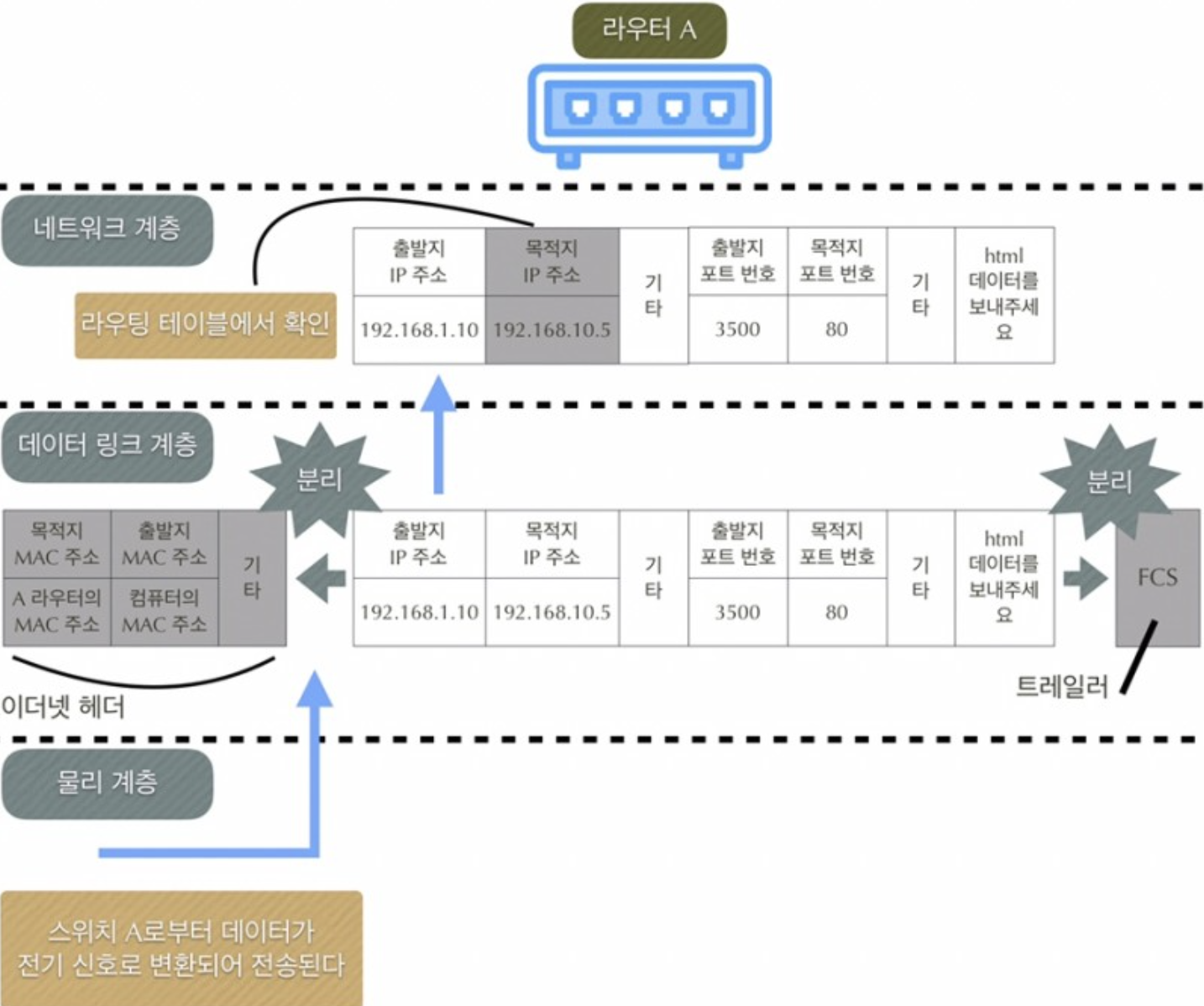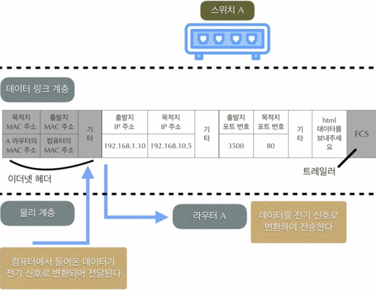 - 스위치 A는 데이터 링크 계층에서 데이터를 전기 신호로 변환하여 라우터 A로 전송