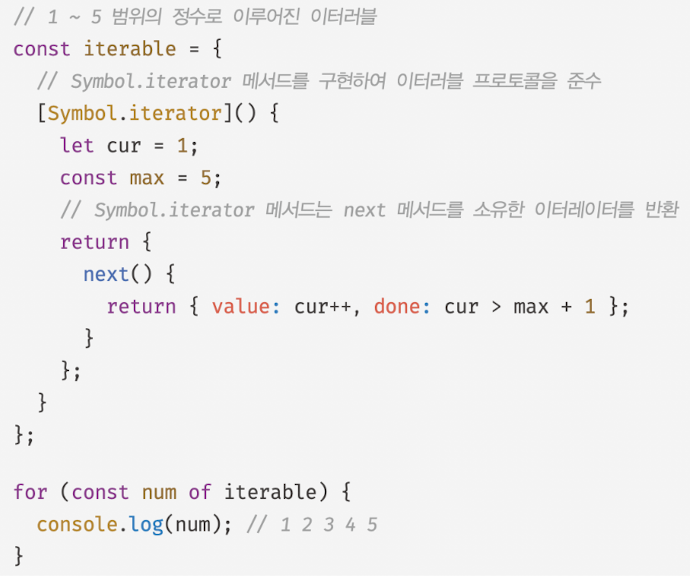 - Well-known Symbol인 Symbol.iterator를 키로 갖는 메서드를 객체에 추가하고 이터레이터를 반환하도록 구현하면 그 객체를 이터러블이 됨