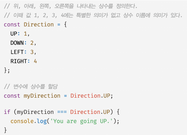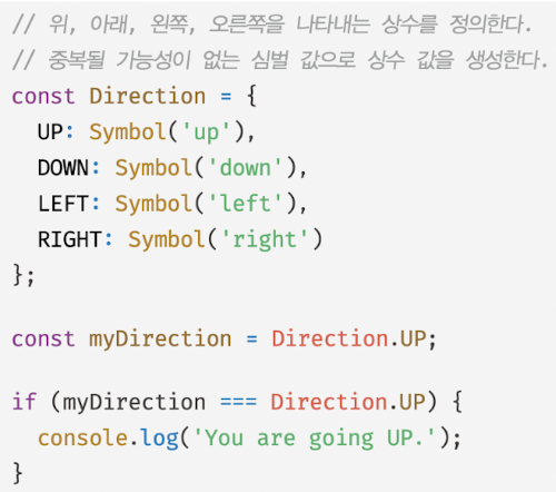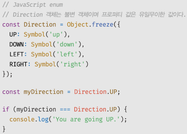 - 자바스크립트에서 enum을 흉내내어 사용하려면 다음과 같이 객체의 변경을 방지하기 위해 객체를 동결하는 Object.freeze 메서드와 심벌 값을 사용