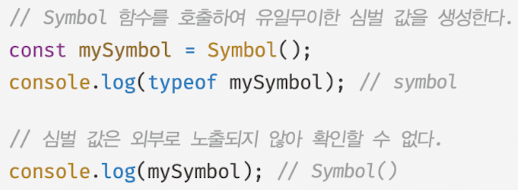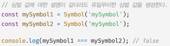 - 심벌값은 암묵적으로 문자열이나 숫자 타입으로 변환되지 않음