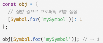 - 심벌 값은 유일무이한 값이므로 심벌 값으로 프로퍼티 키를 만들면 다른 프로퍼티 키와 충돌하지 않음