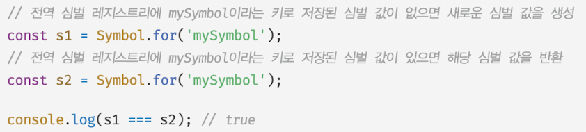 - Symbol.for 메서드는 인수로 전달받은 문자열을 키로 사용해 키와 심벌 값의 쌍들이 저장되어 있는 전역 심벌 레지스트라에서 해당 키와 일치하는 심벌 값 검색