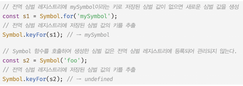 - 이때 자바스크립트 엔진이 관리하는 심벌 값 저장소인 전역 심벌 레지스트리에서 심벌 값을 검색할 수 있는 키를 지정할 수 없으므로 전역 심벌 레지스크리에 등록되어 관리되지 않음