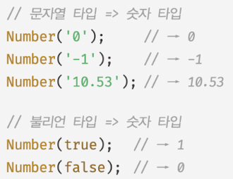 - Number 생성자 함수의 인수로 숫자가 아닌 값을 전달하면 인수를 숫자로 강제 변환 후 [[NumberData]] 내부 슬롯에 변환된 숫자를 할당한 Number 래퍼 객체 생성