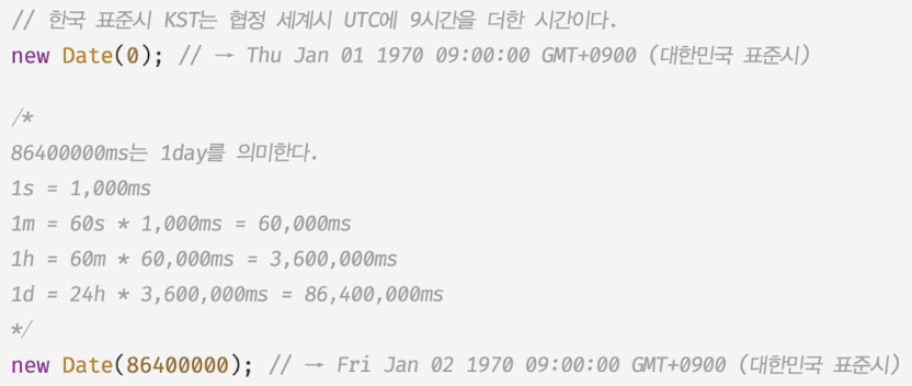 - 1970년 1월 2일 00:00:00 = 86,400,000(24h*60m*60s*1000ms)