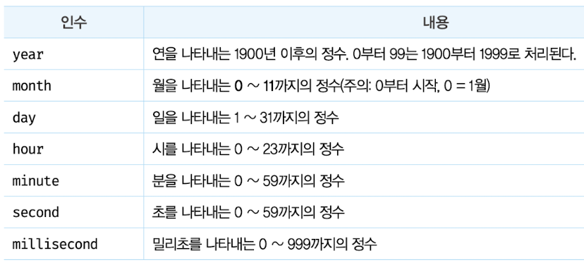 - month는 월을 의미하는 0~11까지의 정수이므로 주의
