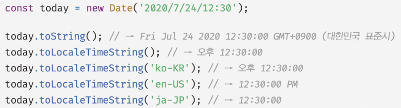 - 인수로 전달한 로캘을 기준으로 Date 객체의 시간을 표현한 문자열 반환