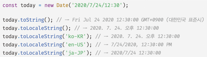 - 인수로 전달한 로캘을 기준으로 Date 객체의 날짜와 시간을 표현한 문자열 반환
