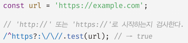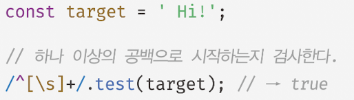- 정규표현식을 사용하는 메서드는 RegExp.prototype.exec, RegExp.prototype.test, String.prototype.match, String.prototype.replace, String.prototype.search, String.prototype.split 등이 있음