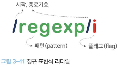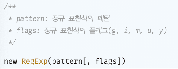 - 정규 표현식의 패턴은 문자열의 일정한 규칙을 표현하기 위해 사용하며 정규 표현식의 플래그는 정규 표현식의 검색 방식을 설정하기 위해 사용
