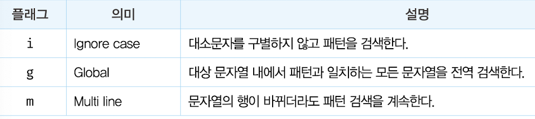 - 패턴과 함께 정규표현식을 구성하는 플래그는 정규 표현식의 검색 방식을 설정하기 위해 사용
