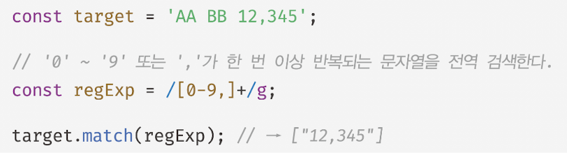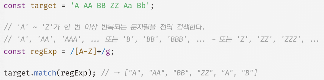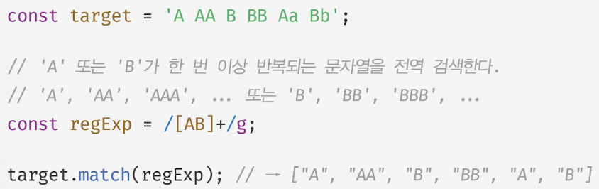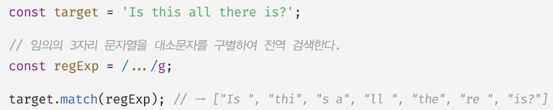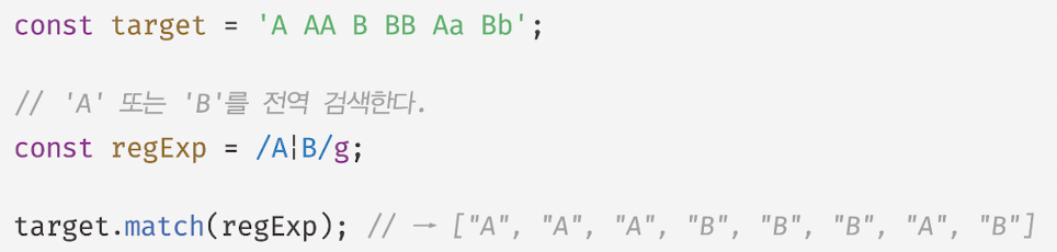 - 플래그 g 사용 : 검색 대상 문자열 내에서 패턴과 매치하는 모든 문자열을 전역 검색