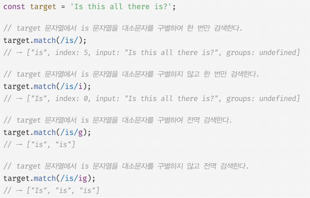 - String.prototype.match 메서드는 g 플래그가 지정되면 모든 매칭 결과를 배열로 반환