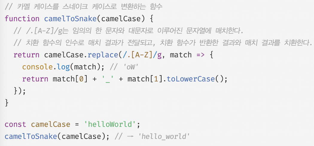 - replace 메서드는 첫번째 인수로 전달한 문자열 또는 정규 표현식에 매치한 결과를 두번째 인수로 전달한 치환 함수의 인수로 전달하면서 호출하고 치환 함수가 반환한 결과와 매치 결과 치환