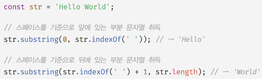 - indexOf 메서드와 함께 사용 시 특정 문자열을 기준으로 앞 뒤에 위치한 부분 문자열 취득 가능