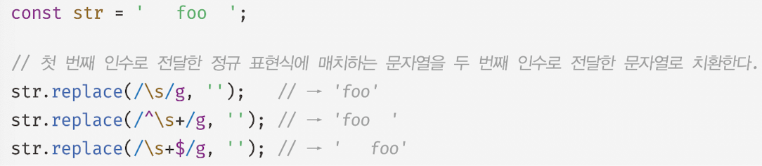 - 대상 문자열에서 첫번째 인수로 전달받은 문자열 또는 정규표현식을 검색해 두번째 인수로 전달한 문자열로 치환한 문자열 반환