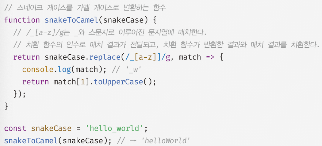 - replace 메서드는 첫번째 인수로 전달한 문자열 또는 정규 표현식에 매치한 결과를 두번째 인수로 전달한 치환 함수의 인수로 전달하면서 호출하고 치환 함수가 반환한 결과와 매치 결과 치환