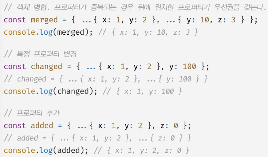 - 스프레드 프로퍼티가 제안되기 이전에는 ES6에서 도입된 Object.assign 메서드를 사용해 여러개의 객체를 병합하거나 특정 프로퍼티를 변경 또는 추가했음