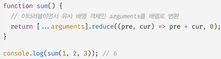 - arguments 객체는 이터러블이면서 유사 배열객체라서 스프레드 문법의 대상이 될 수 있음
