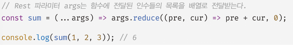 - Rest 파라미터는 함수에 전달된 인수들의 목록을 배열로 전달받기 위해 매개변수 이름앞에 ...을 붙이는 것