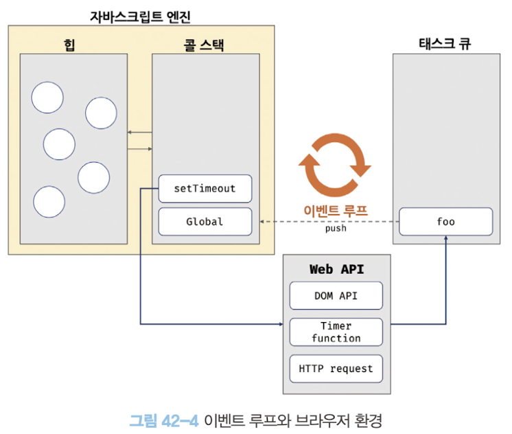 - 비동기 방식으로 동작하는 setTimeout의 콜백함수의 평가와 실행은 자바스크립트 엔진이 담당하지만 호출 스케줄링을 위한 타이머 설정과 콜백 함수의 등록은 브라우저 또는 Node.js 담당