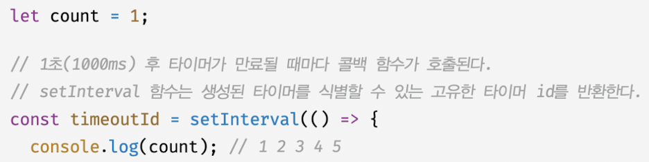 - 이후 타이머가 완료될때마다 첫번째 인수로 전달받은 콜백 함수가 반복 호출되며 타이머가 취소될때 까지 반복
