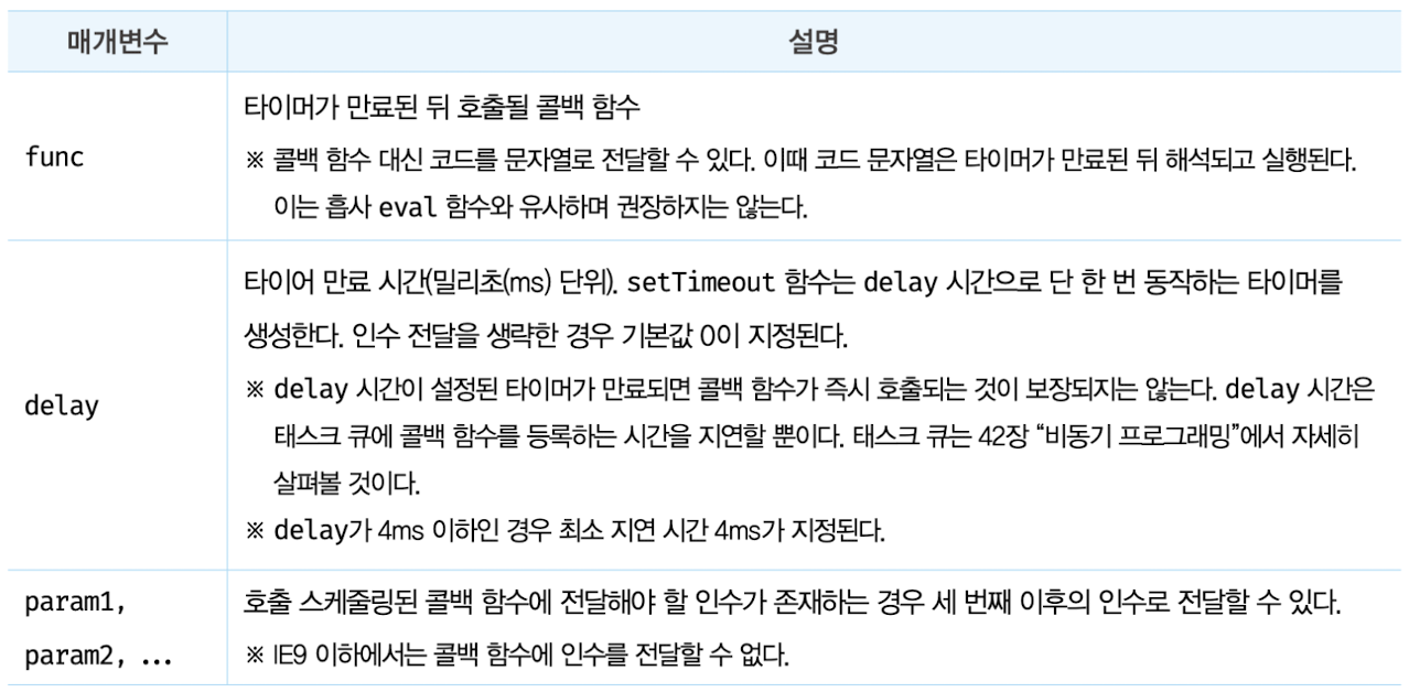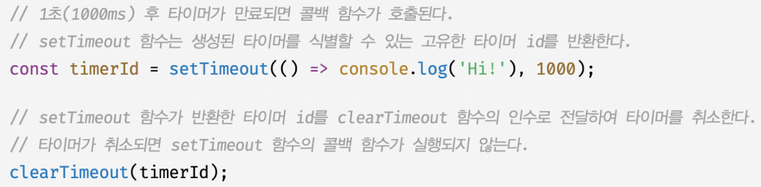 - setTimeout 함수가 반환한 타이머 id를 clearTimeout 함수의 인수로 전달해 타이머 취소 가능