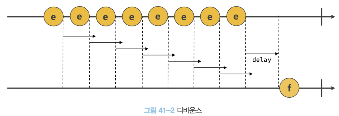 - 짧은 시간 간격으로 연속해서 발생하는 이벤트를 그룹화해서 일정 시간 단위로 이벤트 핸들러가 호출되도록 호출 주기를 만듦