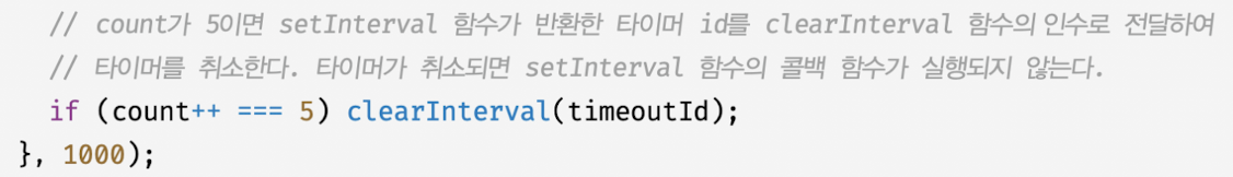 - setInterval 함수가 반환한 타이머 id를 clearInterval 함수의 인수로 전달해 타이머 취소 가능