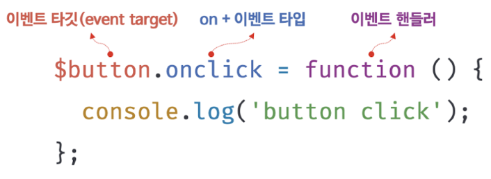 이벤트 핸들러 등록 위해서는 이벤트 타깃, 이벤트 타입, 이벤트 핸들러 지정