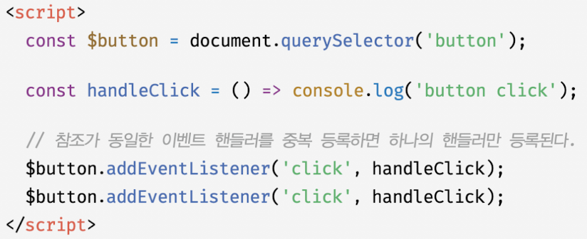 만약 addEventListener 메서드를 통해 참조가 동일한 이벤트 핸들러를 중복 등록하면 하나의 이벤트 핸들러만 등록
