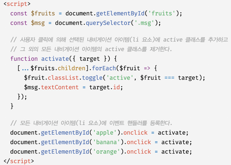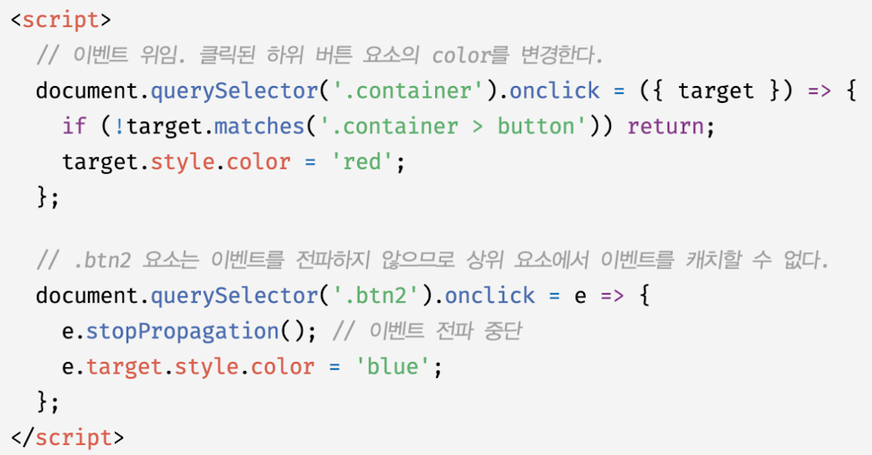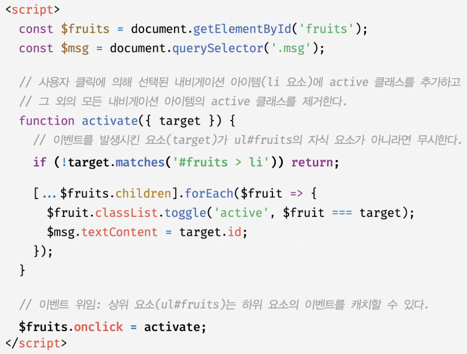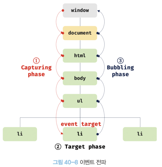 상위 요소에 이벤트 핸들러를 등록하기 때문에 이벤트 타깃, 즉 이벤트를 실제로 발생시킨 DOM 요소가 개발자가 기대한 DOM 요소가 아닐 수 있음