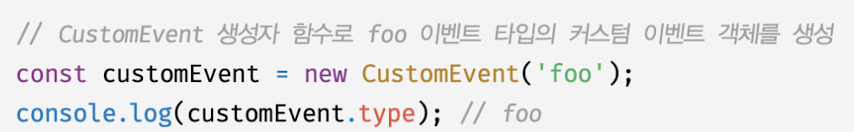 - 기존 이벤트 타입이 아닌 임의의 문자열 사용하여 새로운 이벤트 타입 지정 가능 =>일반적으로 CustomEvent 이벤트 생성자 함수 사용
