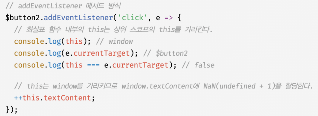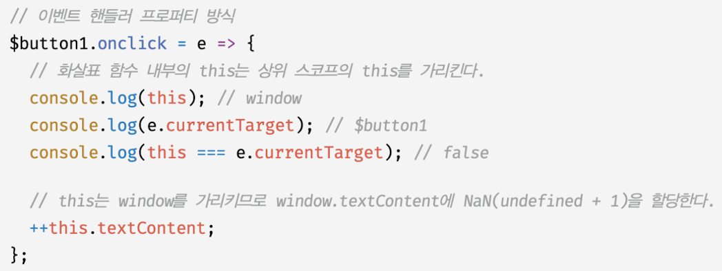화살표 함수로 정의한 이벤트 핸들러 내부의 this는 상위 스코프의 this 가리킴