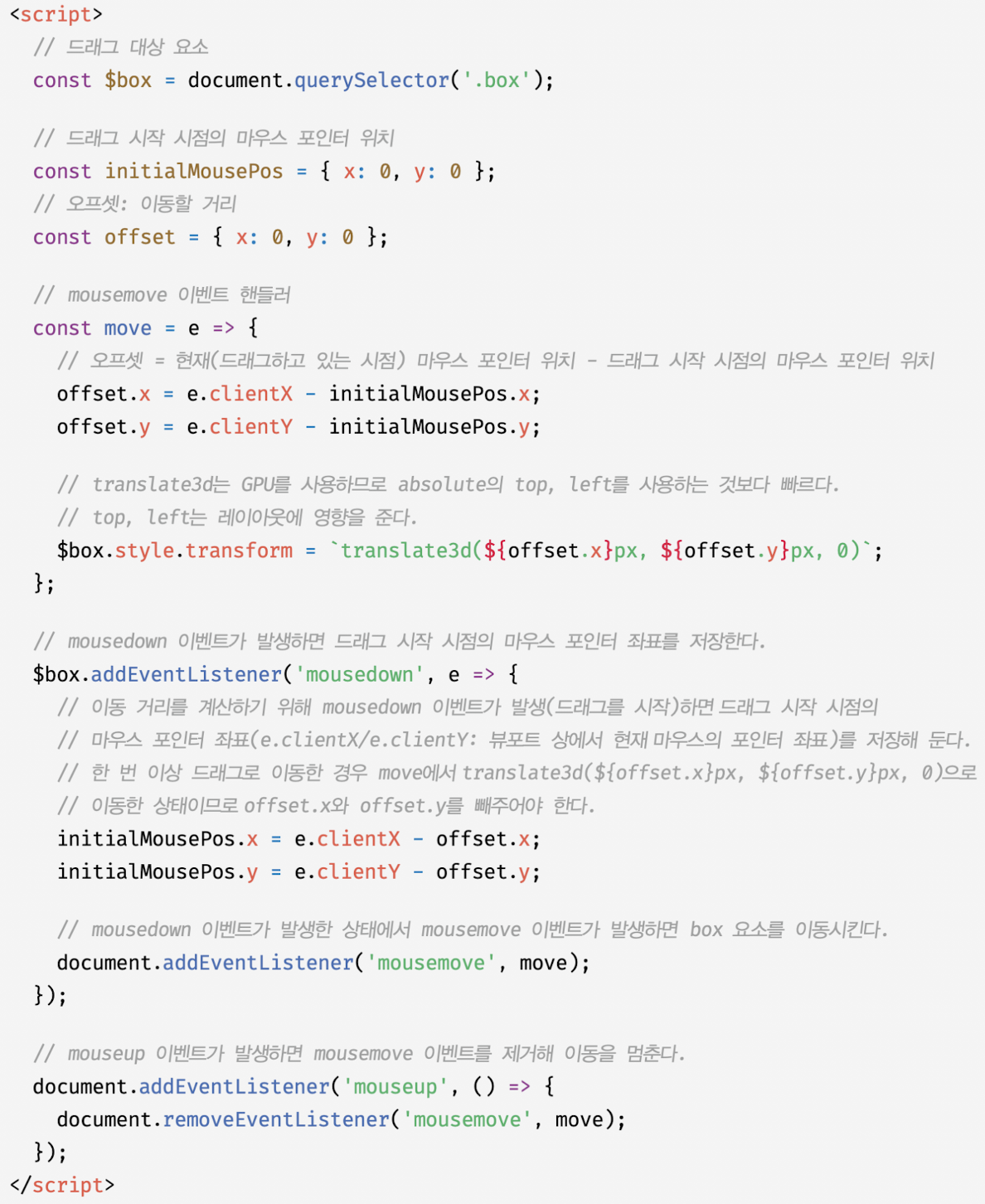 mousedown, mousemove, mouseup 이벤트가 발생하면 생성되는 MouseEvent 타입의 이벤트 객체는 마우스 포인터의 좌표 정보를 나타내는 screenX/screenY, clientX/clientY, pageX/pageY, offsetX/offsetY 프로퍼티 제공