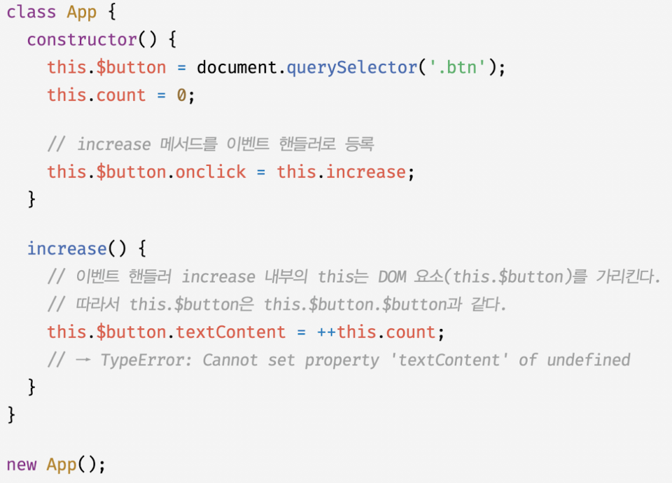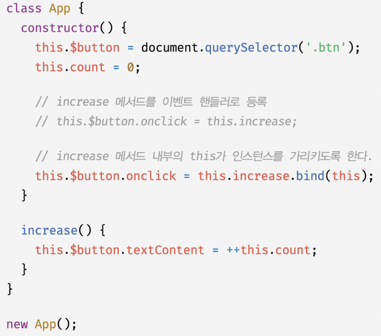 따라서 increase 메서드를 이벤트 랜들러로 바인딩할 때 bind 메서드를 사용해 this를 전달해 increase 메서드 내부의 this가 클래스가 생성할 인스턴스를 가리키도록 해야함
