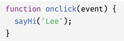 onclick="sayHi('Lee')" 어트리뷰트는 파싱되어 다음과 같은 함수를 암묵적으로 생성하고 이벤트 핸들러 어트리뷰트 이름과 동일한 키 onclick 이벤트 핸들러 프로퍼티에 할당