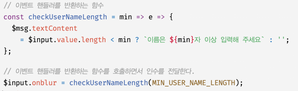 이벤트 핸들러를 반환하는 함수를 호출하면서 인수 전달