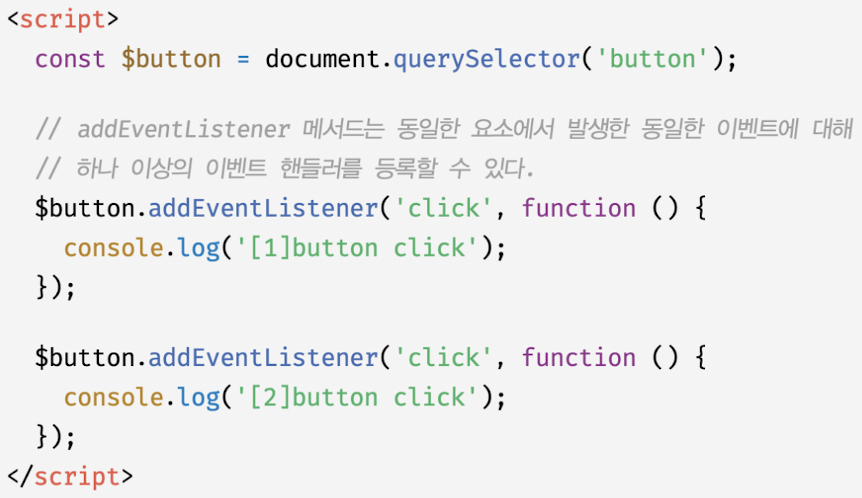 동일한 HTML 요소에 동일한 이벤트에 대해 하나 이상의 이벤트 핸들러 등록 가능