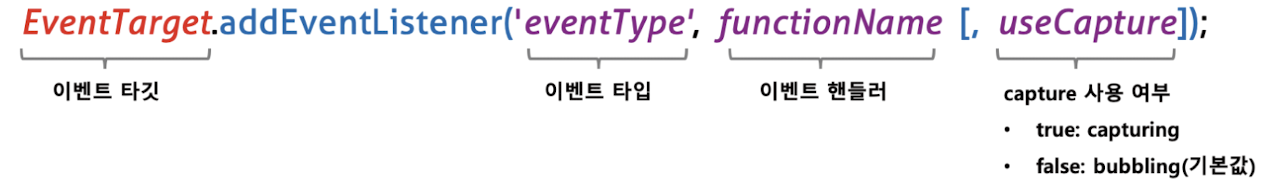 - 마지막 매개변수 : 이벤트를 캐치할 이벤트 전파 단계 캡처링 또는 버블링 지정