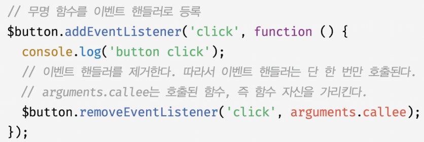 기명함수를 이벤트 핸들러로 등록할 수 없다면 호출된 함수, 즉 자신을 가리키는 arguments.callee 사용 가능