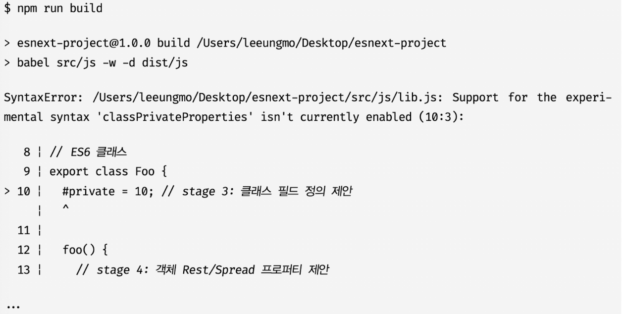 - @babel/preset-env가 현재 제안 단계에 있는 사양에 대한 플러그인 지원하지 않기 때문에 발생한 에러