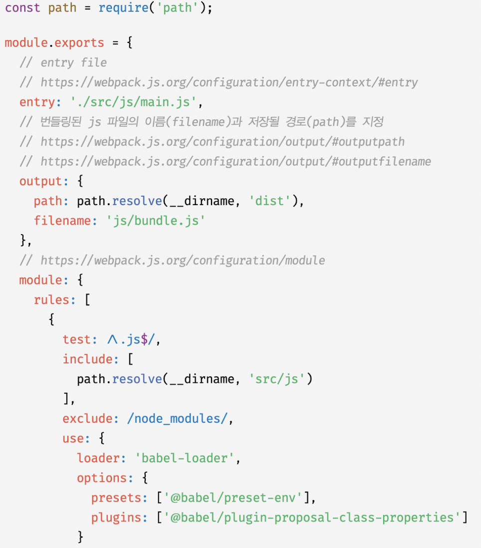 - webpack.config.js는 Webpack이 실행될 때 참조하는 설정 파일