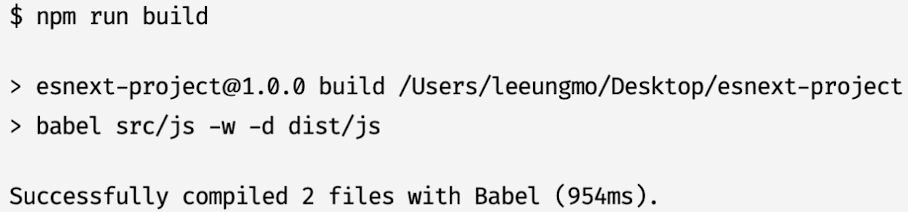 - npm scripts의 build는 src/js 폴더(타깃 폴더)에 있는 모든 자바스크립트 파일들을 트랜스파일링 후 그 결과물을 dist/js 폴더에 저장