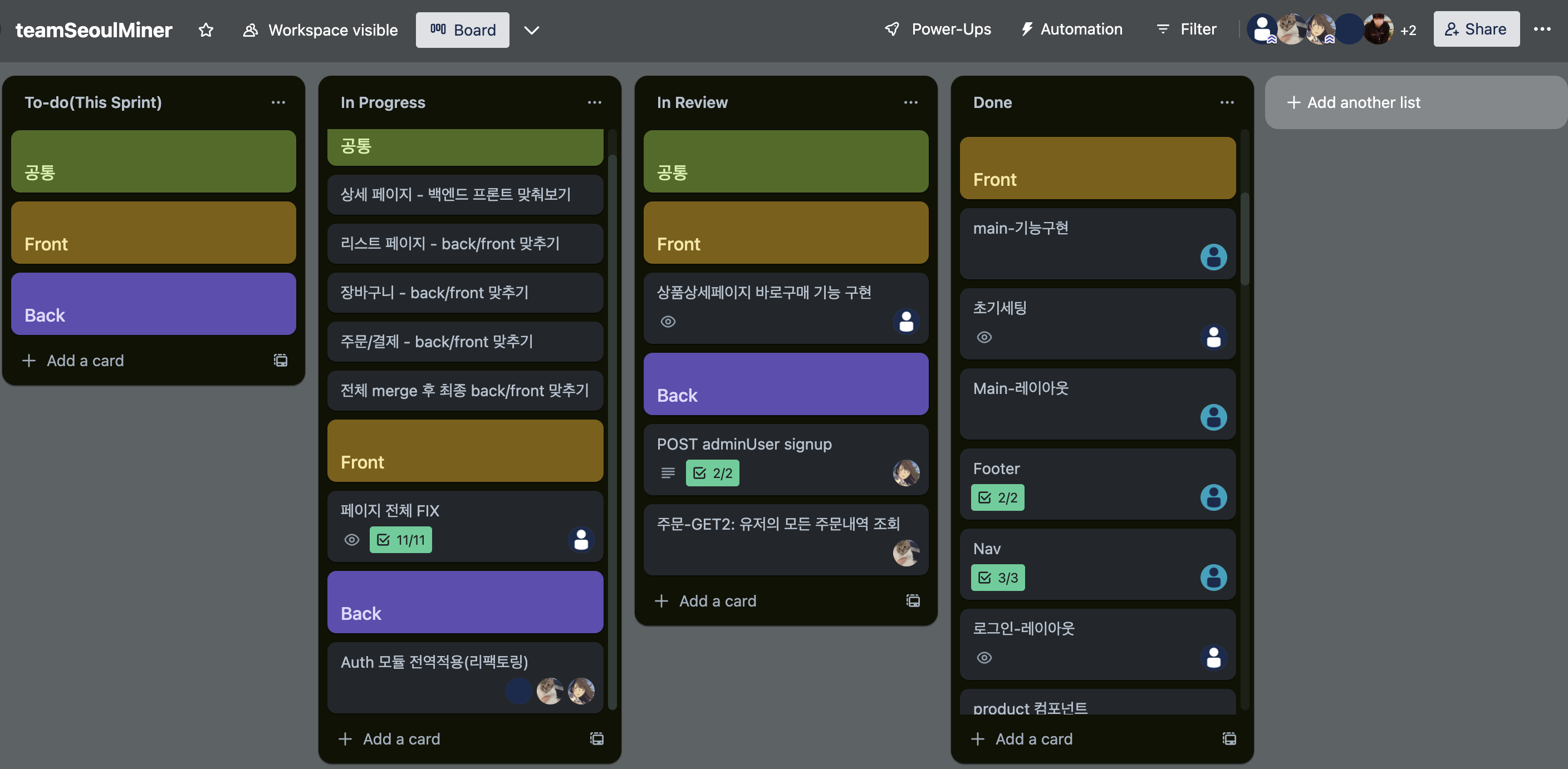 조마다 PM을 project manager와 product manager로 나눠 2명이 리더의 역할을 가져가야 했었다. 그 중 project manager를 맡게 되었고 이번 프로젝트 기간동안 전반적인 트렐로 티켓을 관리하게 되었다. 이번 우리 팀은 나 포함 프론트가 2명 백엔드가 3명으로 프론트 수가 모자란 조였는데도 불구하고 첫번째 주에 정해두었던 목표치를 모두 완료하고 2주차 티켓도 각자 하나씩 더 할 수 있었다. 백엔드 쪽은 다들 뛰어나는 실력을 가지고 있어서 ERD를 짜느라 수요일부터 티켓 배부를 시작했는데 금방 끝내고 다음 티켓 달라고 하셨고 추가구현도 많이 진행하실 수 있었다.