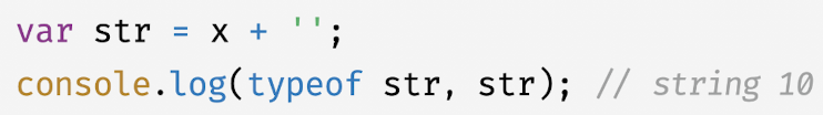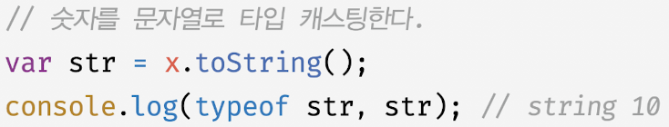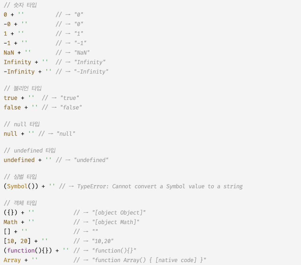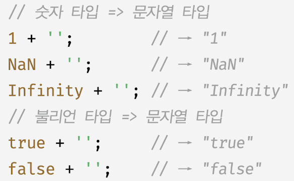 - 자바스크립트 엔진은 문자열 연결 연산자 표현식을 평가하기 위해 문자열 연결 연산자의 피연산자 중에서 문자열 타입이 아닌 피연산자를 문자열 타입으로 암묵적 타입 변환