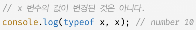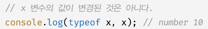 - 자바스크립트 엔진은 표현식을 에러 없이 평가하기 위해 피연산자의 값을 암묵적 타입 변환해 새로운 타입의 값을 만들어 단 한 번 사용하고 버림